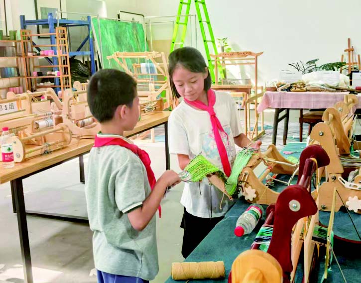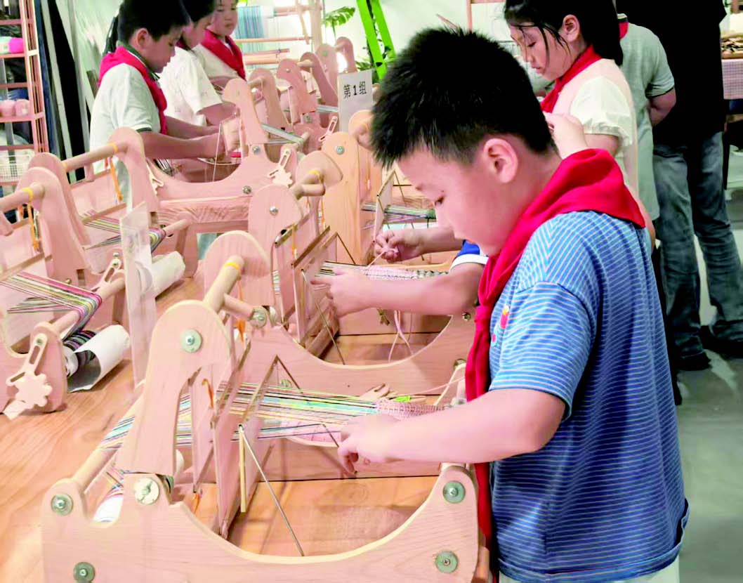 课程进行至最后一期,“小学徒”们还需要自行织成作品参与评比。面对着织布机,孩子们的动作虽然仍显生涩,穿梭、换综、打筘……一不小心,经线纬线就会缠成一团,但是大家毫不泄气,耐着性子仔细操作。“你们看,其实织布是有规律的,找到规律就会快很多。”学员徐梓培拿着梭子,小心翼翼地编织着,随着时间流逝,他的动作逐渐熟练起来,作品也越来越完整。经过课程学习,学员丁荞荞凭借优秀的配色和作品完成度拿到了老师的锦鲤制品奖励,她难掩兴奋地表示,“老师们都非常认真地想要教会我们,我们的学习动力也很足。”