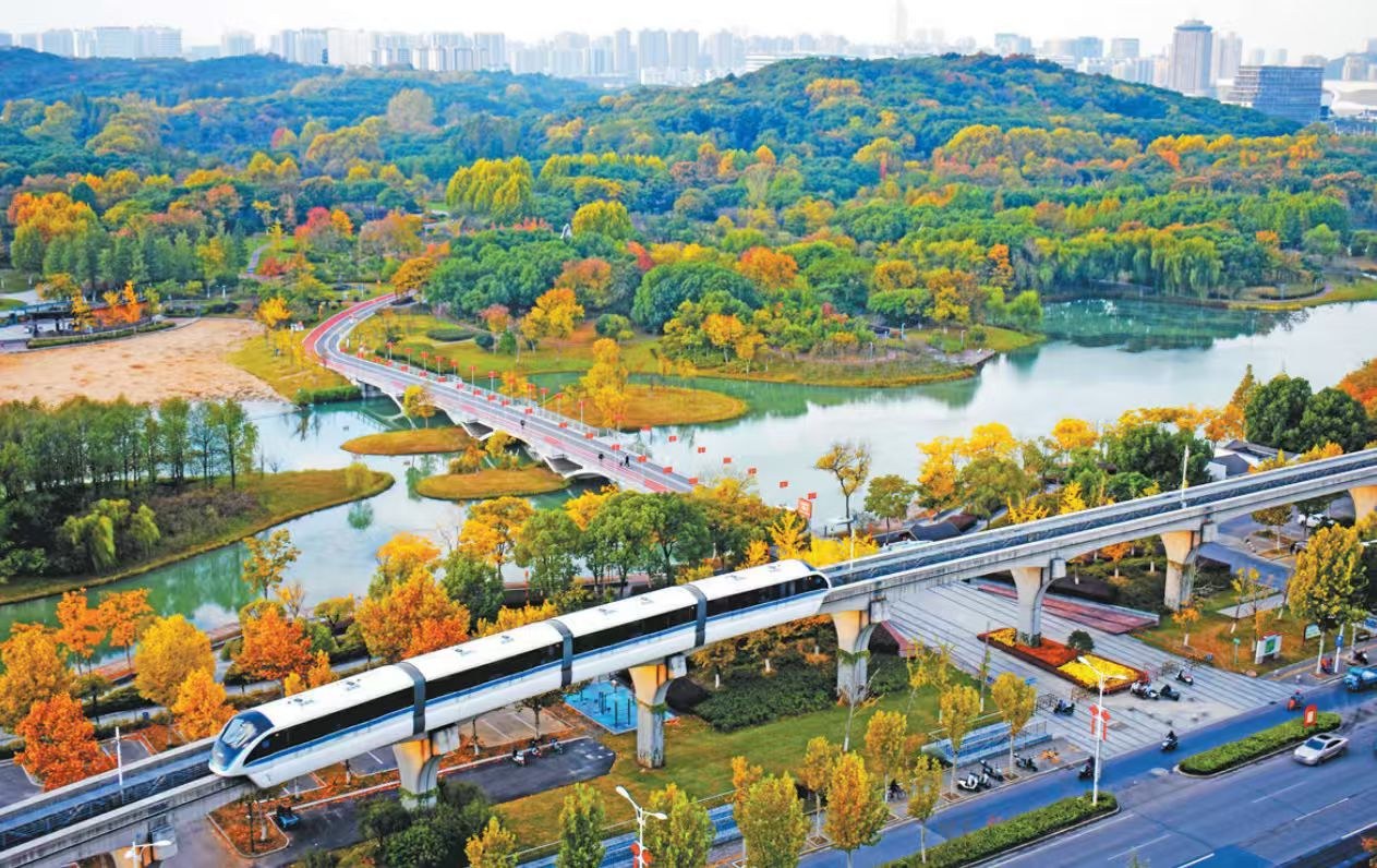 秋日的芜湖市雕塑公园层林尽染、五彩缤纷。图为11月12日,一列单轨列车缓缓驶过,现代交通与自然景观相映成趣,勾勒出城市与生态共生的美好画卷。