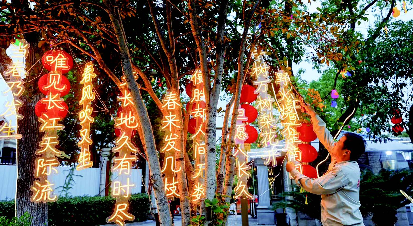 “这边灯带往前挪一点,视觉上更有立体感。”在昌鑫花园小区,两名松开物业工作人员手持工具对悬挂的红灯笼、装饰摆件及节日灯带进行微调,力求每一处装饰都精准美观。
